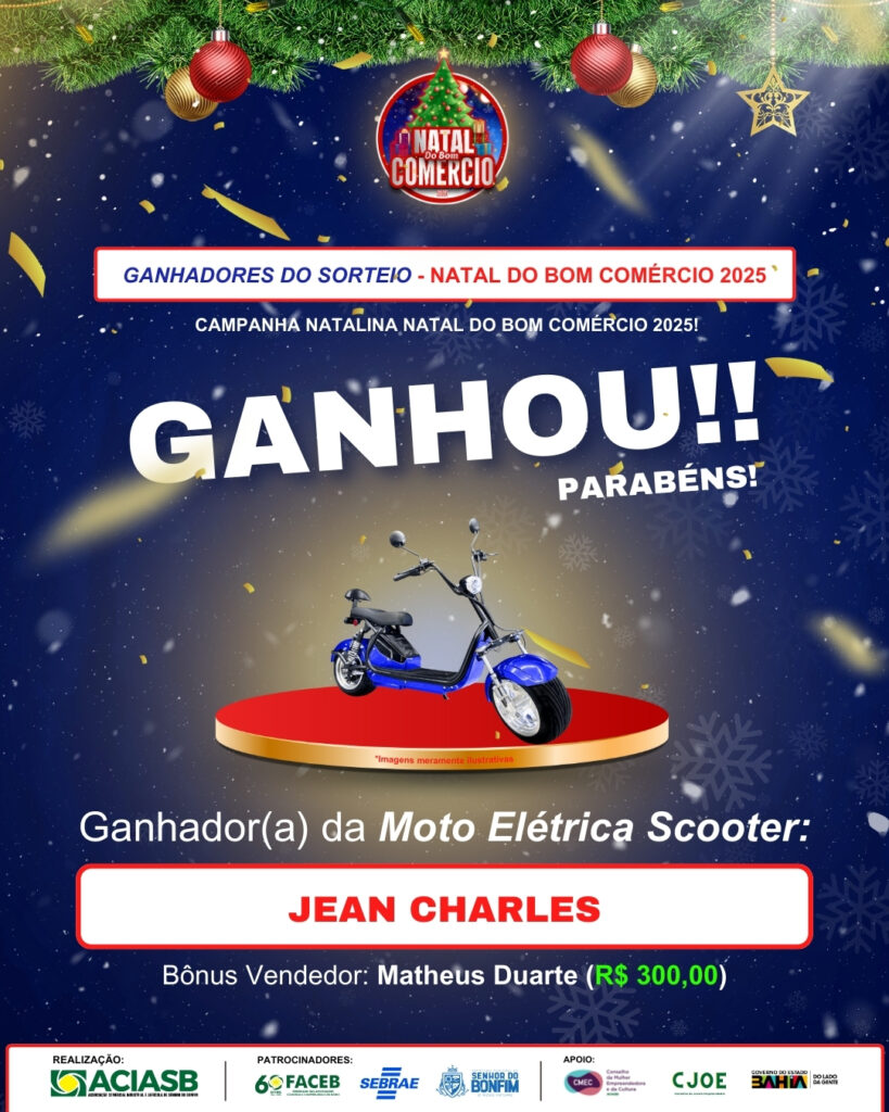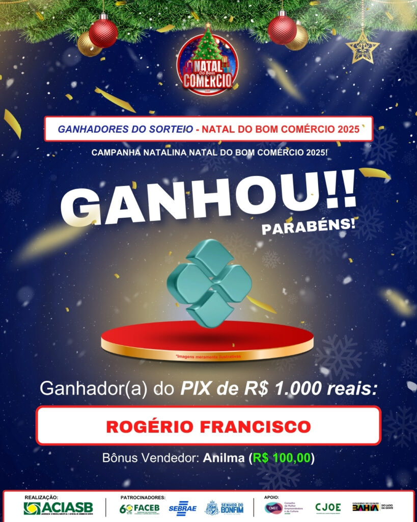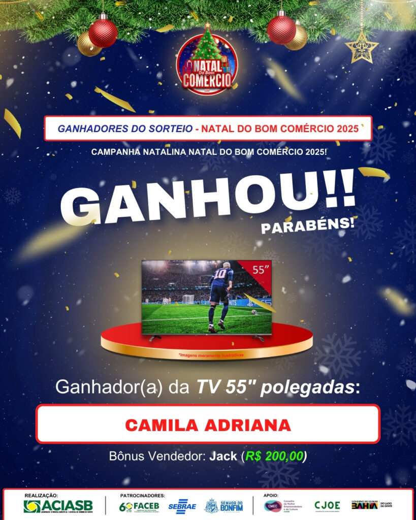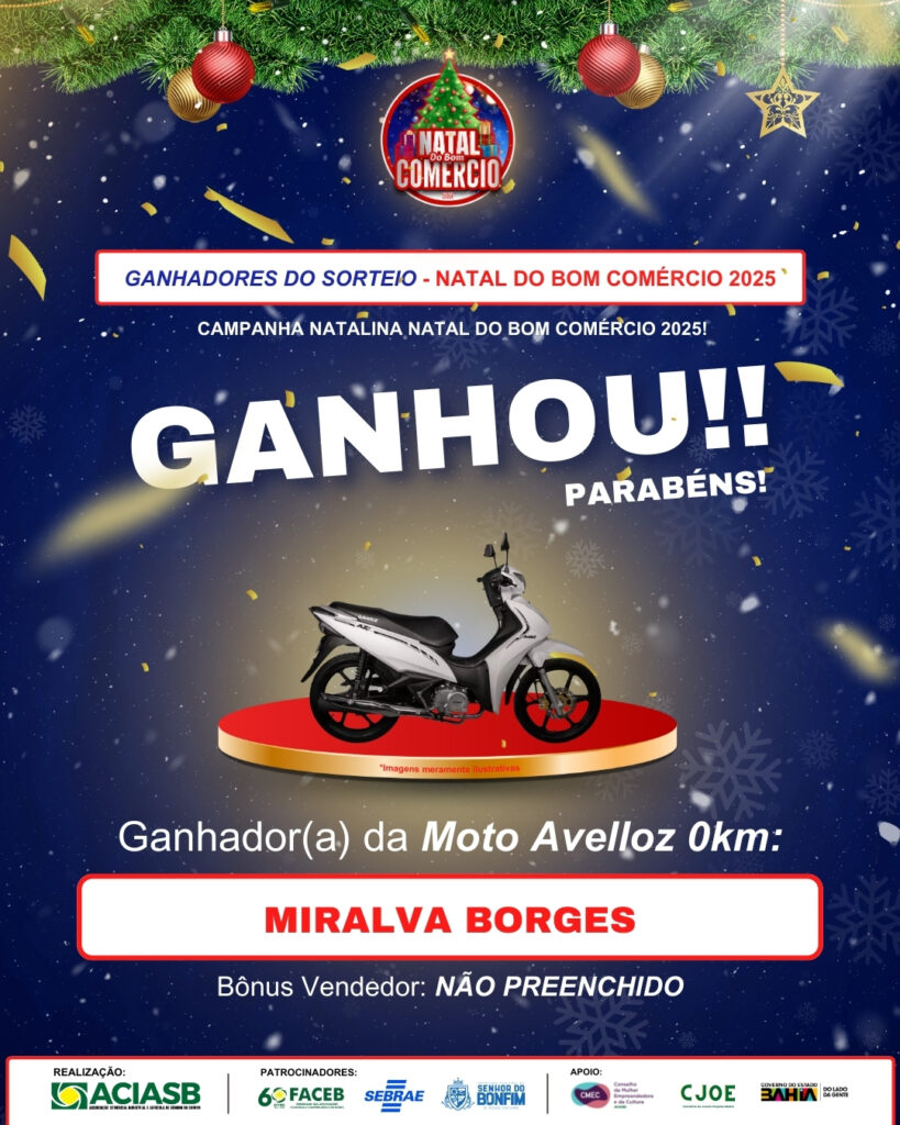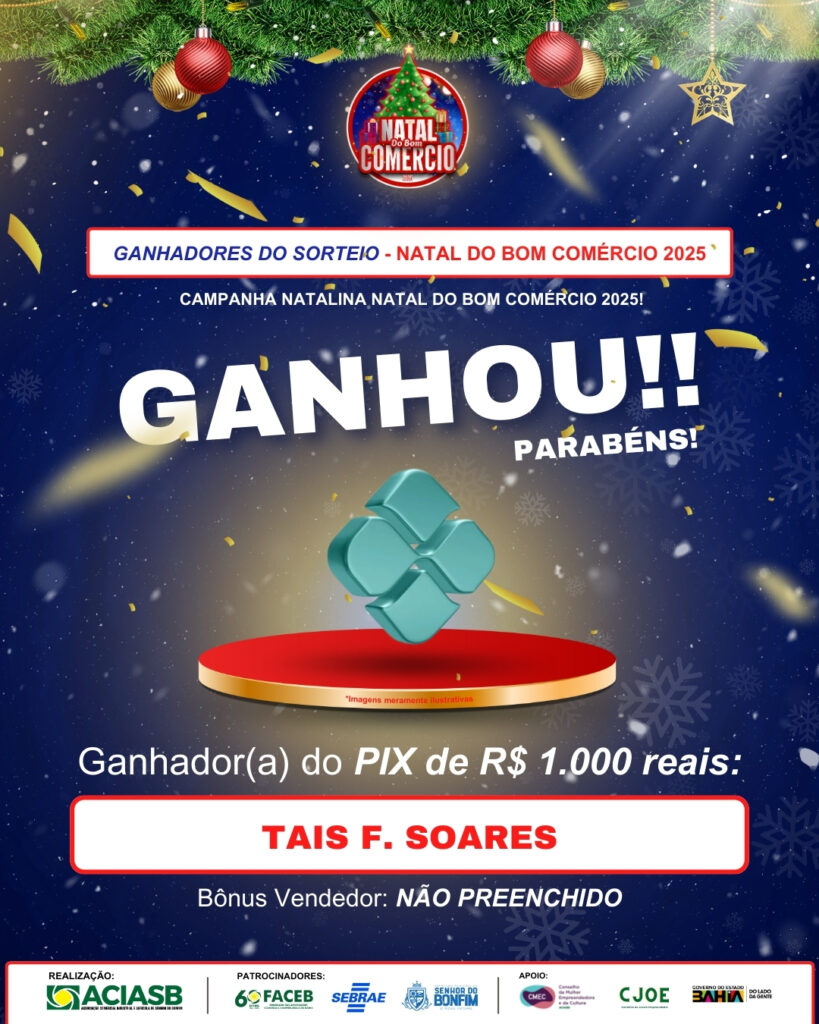 A ACIASB – Associação Comercial e Industrial de Senhor do Bonfim divulgou oficialmente os ganhadores da campanha Natal do Bom Comércio 2025, uma iniciativa que movimentou o comércio local, fortaleceu as empresas participantes e premiou consumidores que prestigiaram o comércio da cidade durante o período natalino.