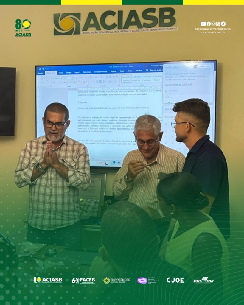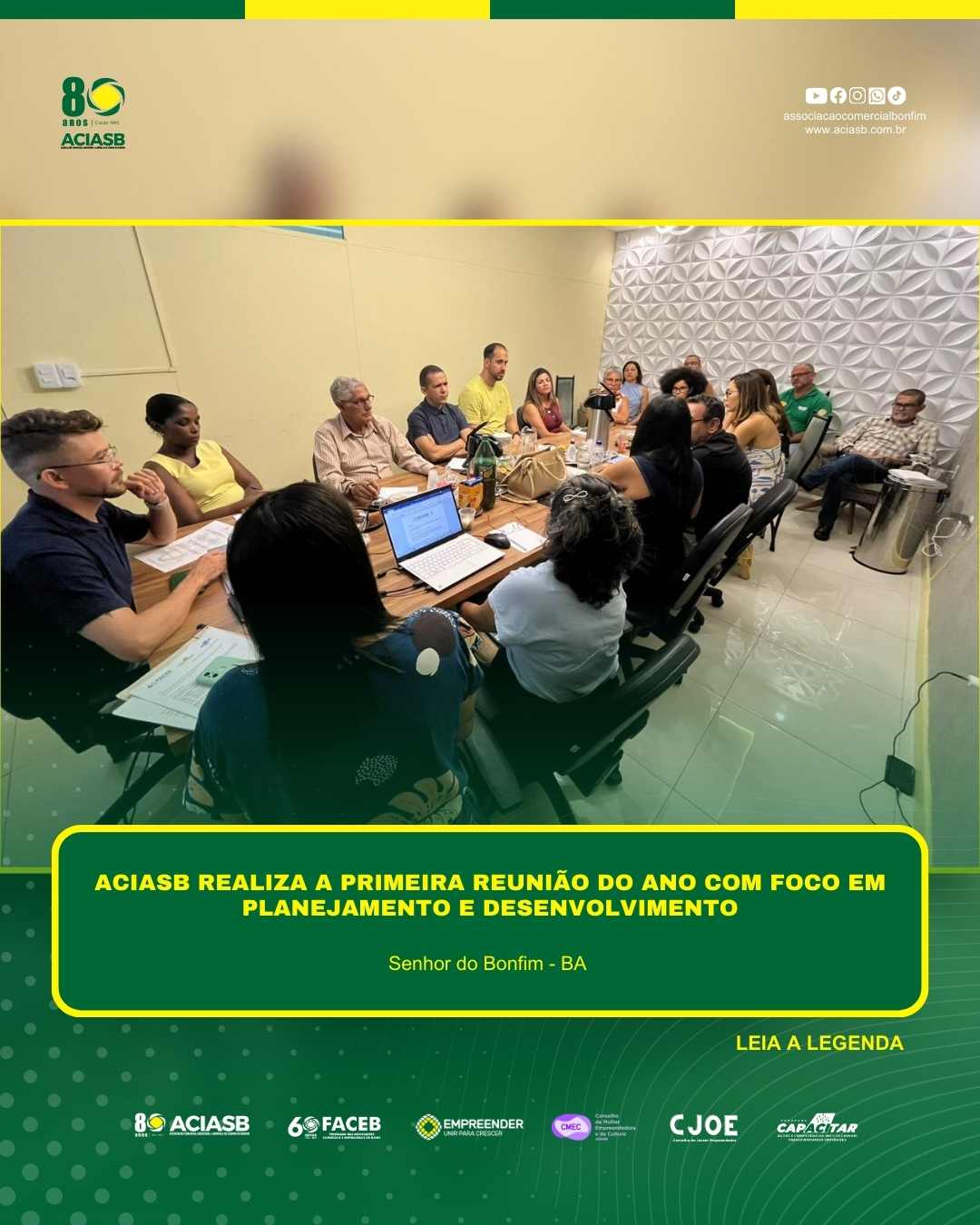 A ACIASB realizou, em janeiro de 2026, a primeira reunião do ano, marcando o início de um novo ciclo de trabalho, planejamento e fortalecimento do comércio de Senhor do Bonfim. O encontro reuniu diretoria, parceiros e representantes do setor empresarial para alinhar metas, discutir ações estratégicas e apresentar projetos que serão desenvolvidos ao longo do ano.