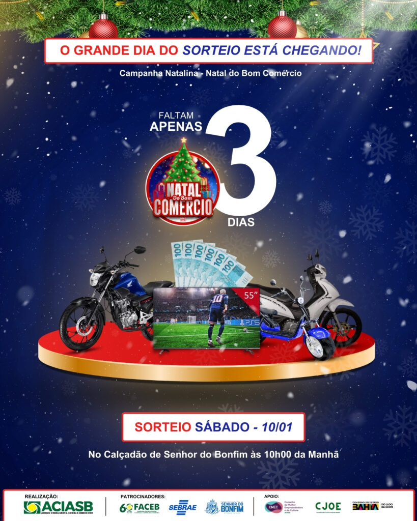 ÚLTIMOS DIAS DE PARTICIPAÇÃO: FALTAM 2 DIAS PARA O SORTEIO DO NATAL DO BOM COMÉRCIO8 de janeiro de 2026